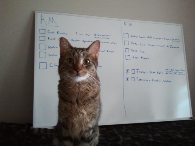 Poor Crepes… We wouldn’t trust a human who needs a chart to remember when he has to feed the kitty and pets him reverse ! Stay safe under the couch ! Purrs