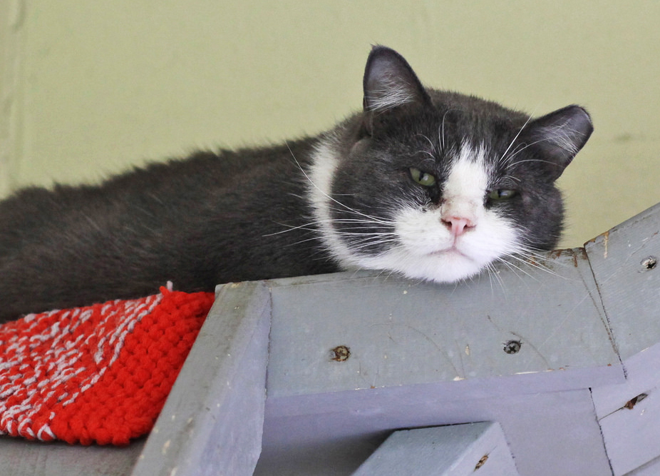 First, Wolfie’s resume: He’s 7 years old, he’s done hard time, and he has FIV. Whoops!  Not exactly a mother’s dream, but the story behind it is amazing. Check this out: Wolfie was living in a semi-feral colony in a military prison in Fort Dix, New Jersey. He and one of the inmates became buddies; Wolfie provided companionship, the inmate provided food. As it turns out, Wolfie LOVES food. When the inmate was about to be transferred, he made arrangements to make a donation to a local shelter to provide for the kitties from the colony that he was leaving behind. Wolfie was released from prison and moved into a minimum security shelter – and that was when they found out he had FIV.