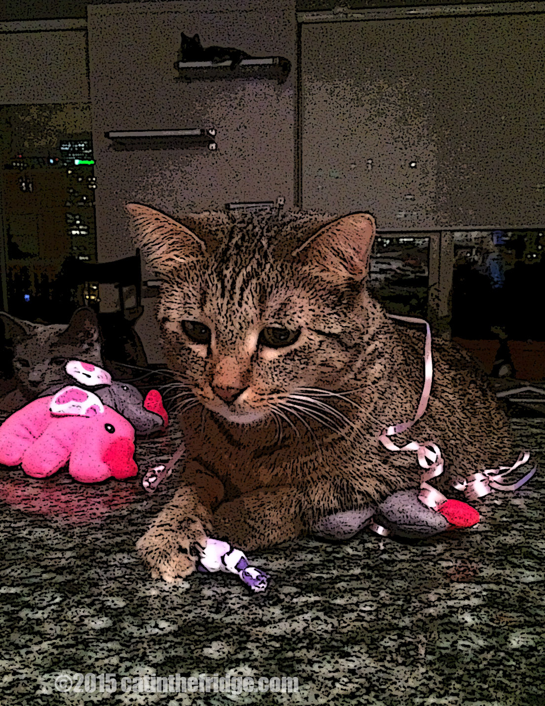 This is the aftermath of my receiving Valentine’s gifts from my date Cody from Cat Chat with Caren and Cody. I played with them and then realized I was alone. I believe I have captured the essence of my gravitas in this self portrait. Thank you for the gifts, Cody, and the despair.