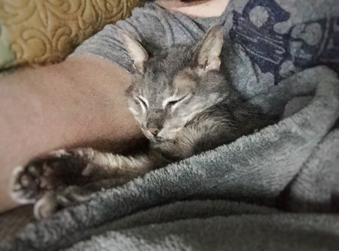 And then, Cotton lived another eight years with no outward signs of his disease until the last few months. Another vet told C that Cotton’s prognosis wasn’t good, and so he once again called on MomFOD for help. This time, though, MomFOD could also tell that Cotton wasn’t well. No longer the plump kitty she remembered, Cotton had lost most of his weight and was clearly dehydrated. He was refusing to eat. MomFOD taught C to administer fluids (with a prescription from his vet) and C valiantly did it all by himself every other day. He mixed special diets and stayed home from work, giving up all his vacation time to make sure that he was with Cotton as much as possible. MomFOD checked on him frequently. They tried other vets, different diets, a blood transfusion, and lots of love. Yet, in the end, Cotton finally succumbed to the awful disease. His red blood cell count was too low. His body was failing.