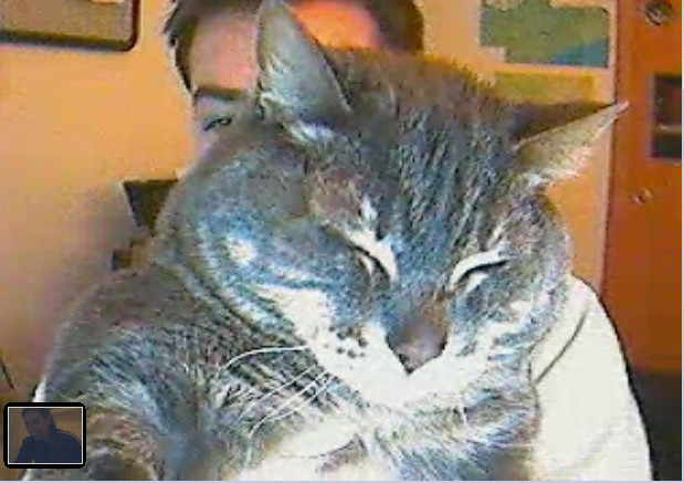 An old video call circa 2008 with Cotton and C in the background and MomFOD in a tiny little square in the corner.